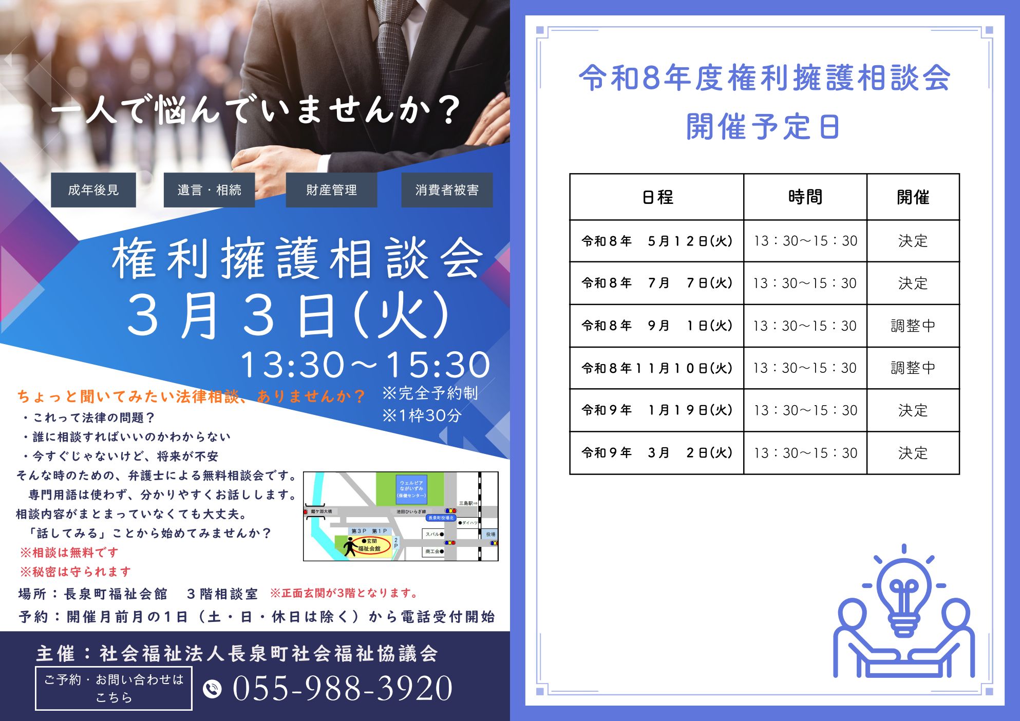 長泉町社会福祉協議会では、隔月で弁護士による無料の法律相談会「権利擁護相談会」を開催します。