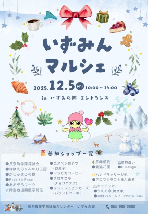 冬のいずみんマルシェ開催 いずみんマルシェ開催のご案内 長泉町在宅福祉総合センターいずみの郷では、地域住民の交流や連携の拠点として、また地域の中で住民の皆さまと支え合いながらともに生きる地域共生社会を目指しています。 今回のいずみんマルシェは、「障害者週間」(毎年12月3日~9日)を通じて、障害および障害のある人に対する理解と関心を広く深め、障害のある人とない人が、お互いに尊重し支え合う機会として開催します。ぜひ、お立ち寄り下さい! 日時:令和7年12月5日(金)10:00~14:00 場所:いずみの郷1階 エントランス 行事情報 開催日時 2025年12月5日 10:00 – 14:00 開催場所:いずみの郷